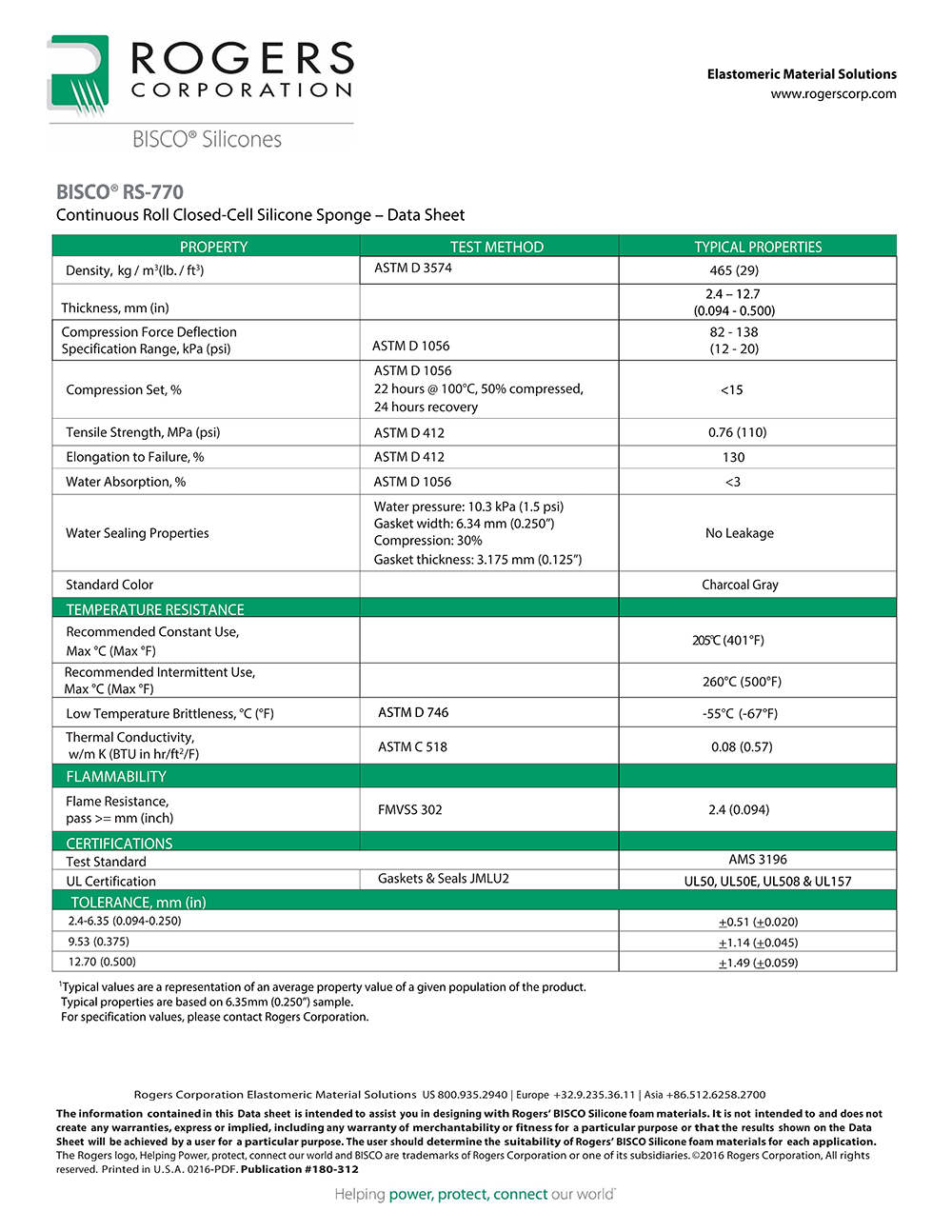 罗杰斯BISCO? RS-770 工业硅胶海绵